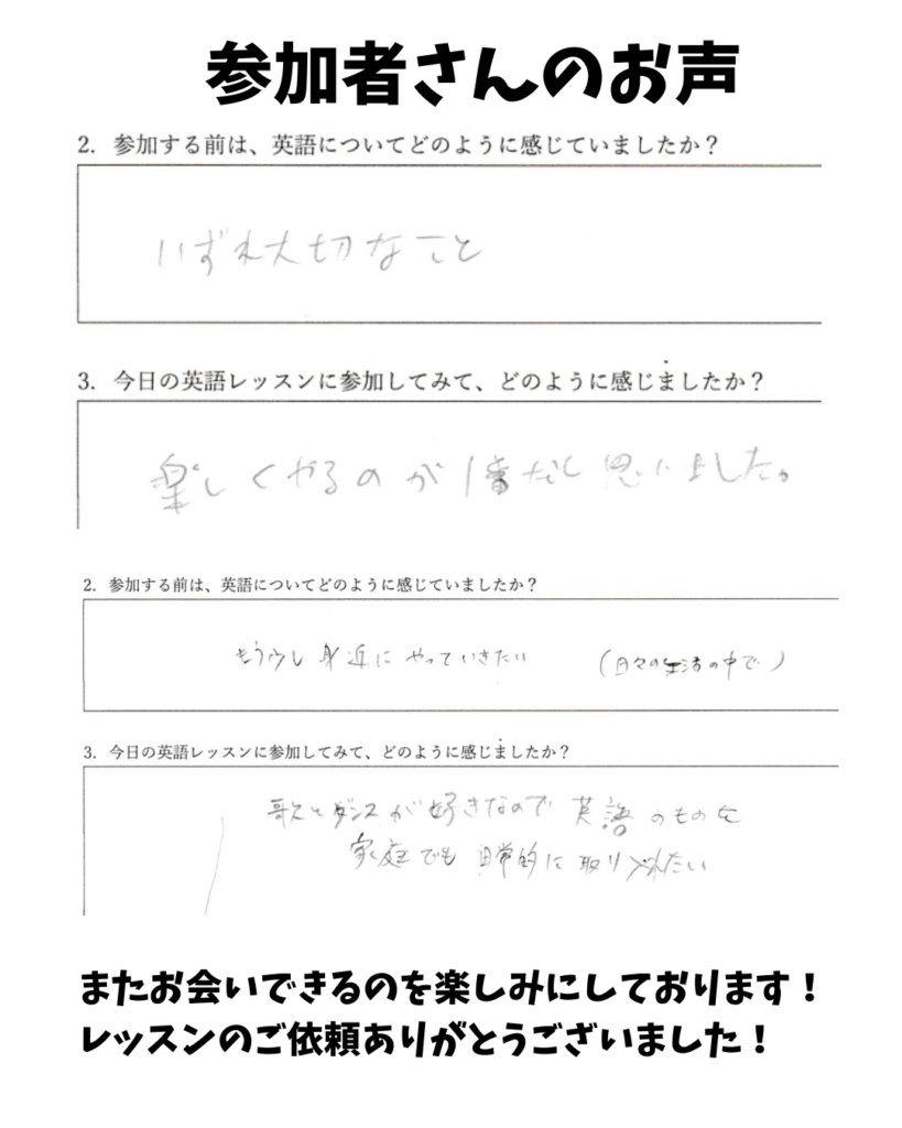 今後も、地域やオンラインで「親子で一緒に楽しめる英語レッスン」を広げてまいります。